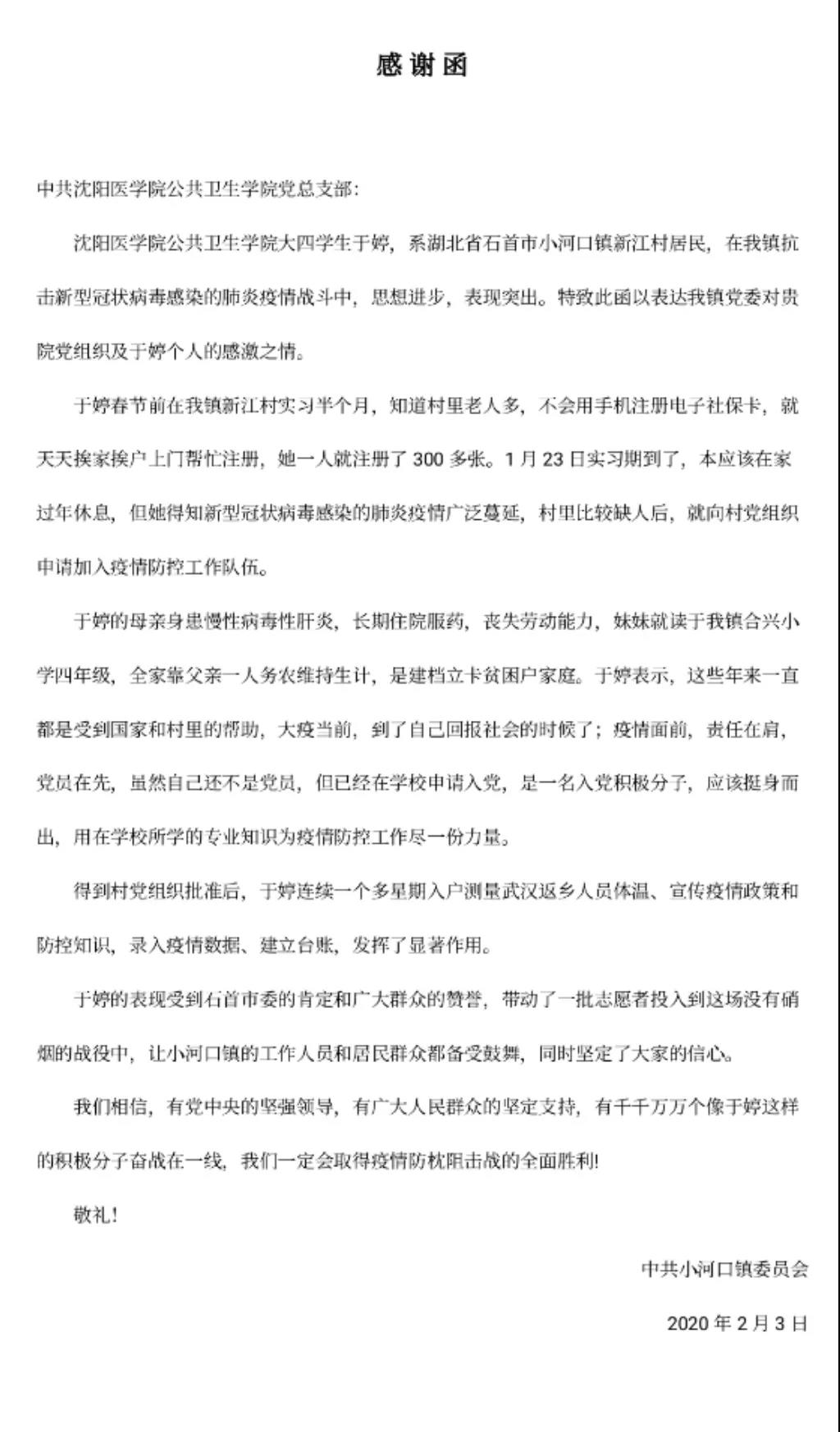 于婷同学的无私付出,温暖了当地每一位村民的心,当地媒体《今日石首》对她的事迹进行了报道,小河口镇党委特向学校发来感谢函,感激沈阳医学院培养了品德高尚、技能高超的学生,为当地疫情防控工作做出了突出贡献。感谢函中提到:“于婷的表现受到石首市委的肯定和广大群众的赞誉,带动了一批志愿者投入到这场没有硝烟的战役中,让小河口镇的工作人员和居民群众都备受鼓舞,同时坚定了大家的信心。我们相信,有党中央的坚强领导,有广大人民群众的坚定支持,有千千万万个像于婷这样的积极分子奋战在一线,我们一定会取得疫情防枕阻击战的全面胜利!”