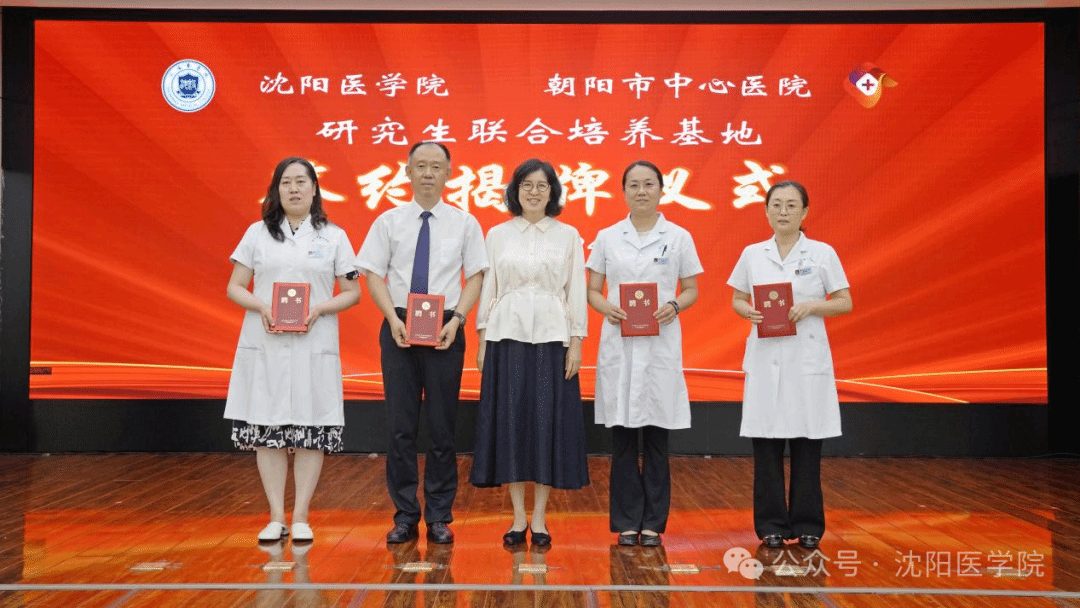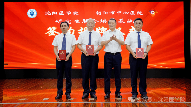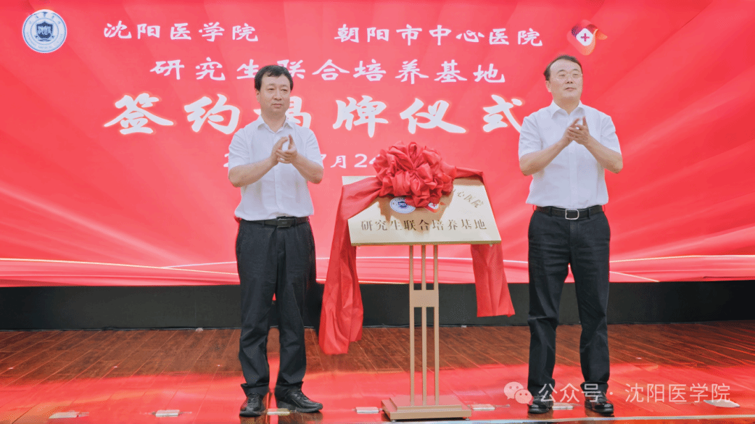 吴玉东校长与刘力东副市长共同为研究生联合培养基地揭牌。李荣梅副校长与朝阳市中心医院党委书记国士刚代表双方签署《沈阳医学院临床医学专业学位硕士研究生联合培养基地协议书》。