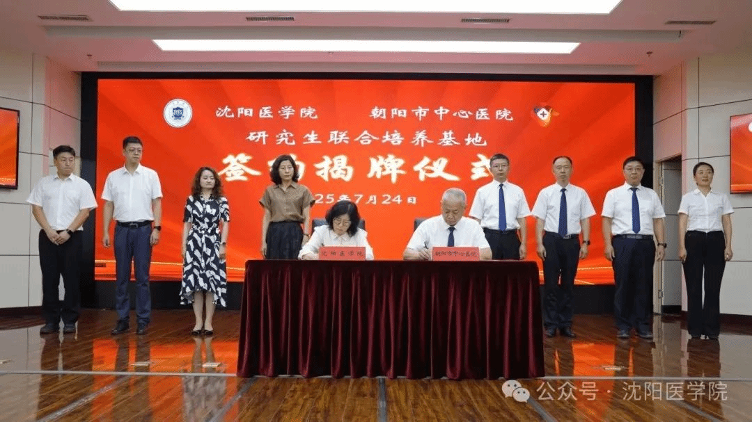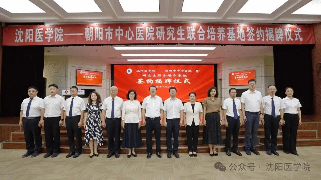 近日,沈阳医学院与朝阳市中心医院在朝阳市中心医院学术报告厅隆重举行研究生联合培养基地签约揭牌仪式。沈阳医学院党委副书记、校长吴玉东,朝阳市副市长刘力东,沈阳医学院副校长李荣梅,朝阳市卫健委主任袁媛,朝阳市中心医院党委书记国士刚,院长李连贺等出席。