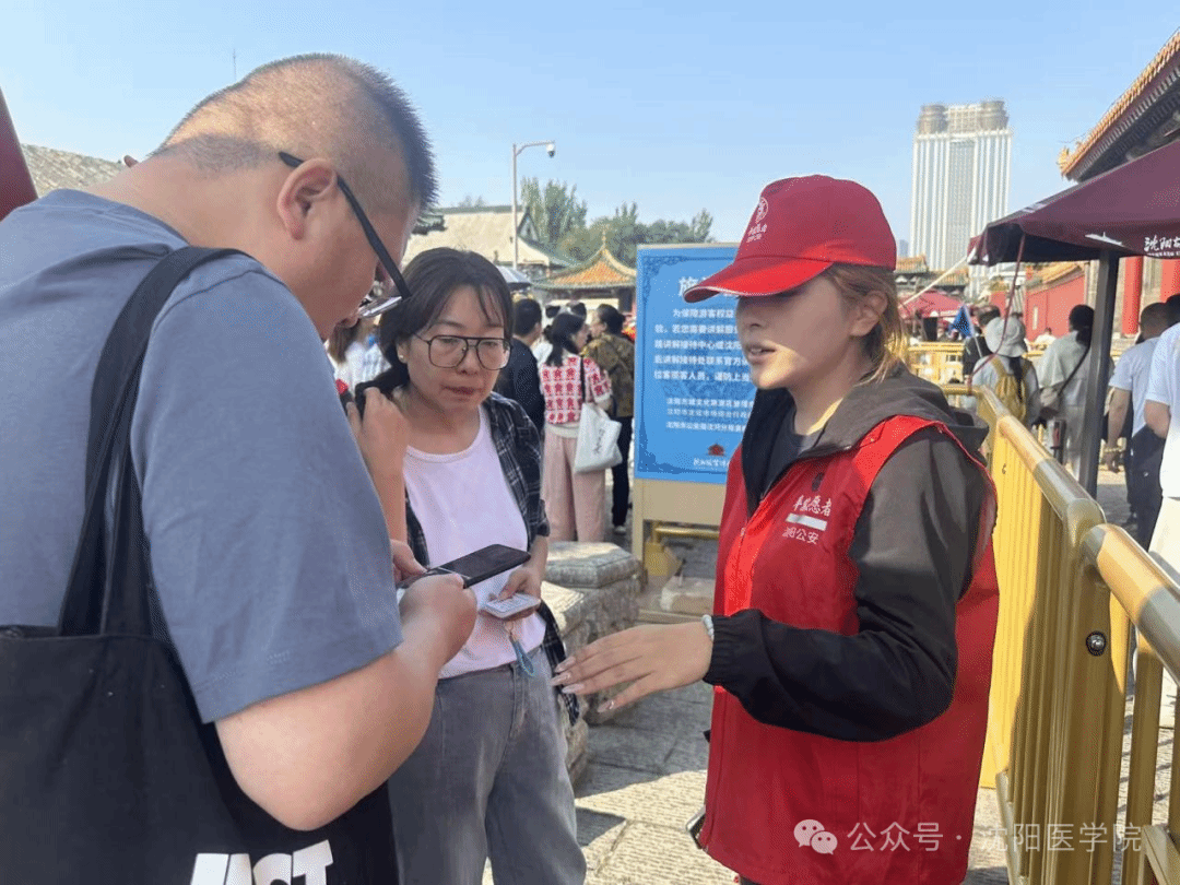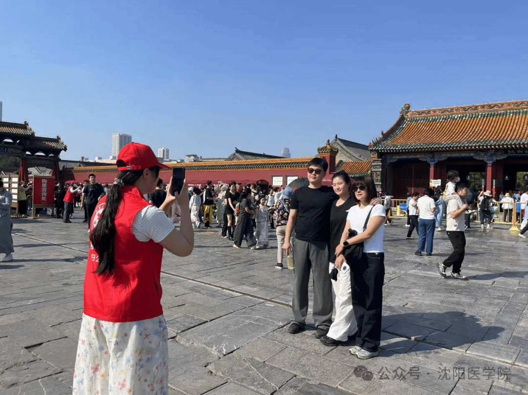 活动期间,志愿者们在校团委和带队教师带领下,每天准时到岗积极开展志愿服务活动。志愿者们分散在沈阳故宫博物院和张学良旧居的主要通道、展厅入口及售票处等10个点位上,面对热情的人潮,他们及时提醒游客有序参观、文明游览,并帮助公安民警疏导人流高峰区域,避免拥挤堵塞;面对游客各类咨询,他们耐心回应,从“展厅位置”“卫生间方向”等基础指引,到“故宫主要建筑名称”“核心文化背景”等简单文化问题,均细致解答,用专业态度为游客扫清游览障碍;面对游客们留念需求,他们还化身摄影师,为游客们留下今秋最美瞬间;面对有特殊需求的游客,他们积极开展各类帮扶,如为携带婴儿车的家庭提供台阶助力,引导使用轮椅的游客前往无障碍入口,为临时需要医疗支援的游客提供力所能及的支持……八天时间,他们始终以饱满的热情和真诚的行动向游客们传递着来自沈医青年的温暖。