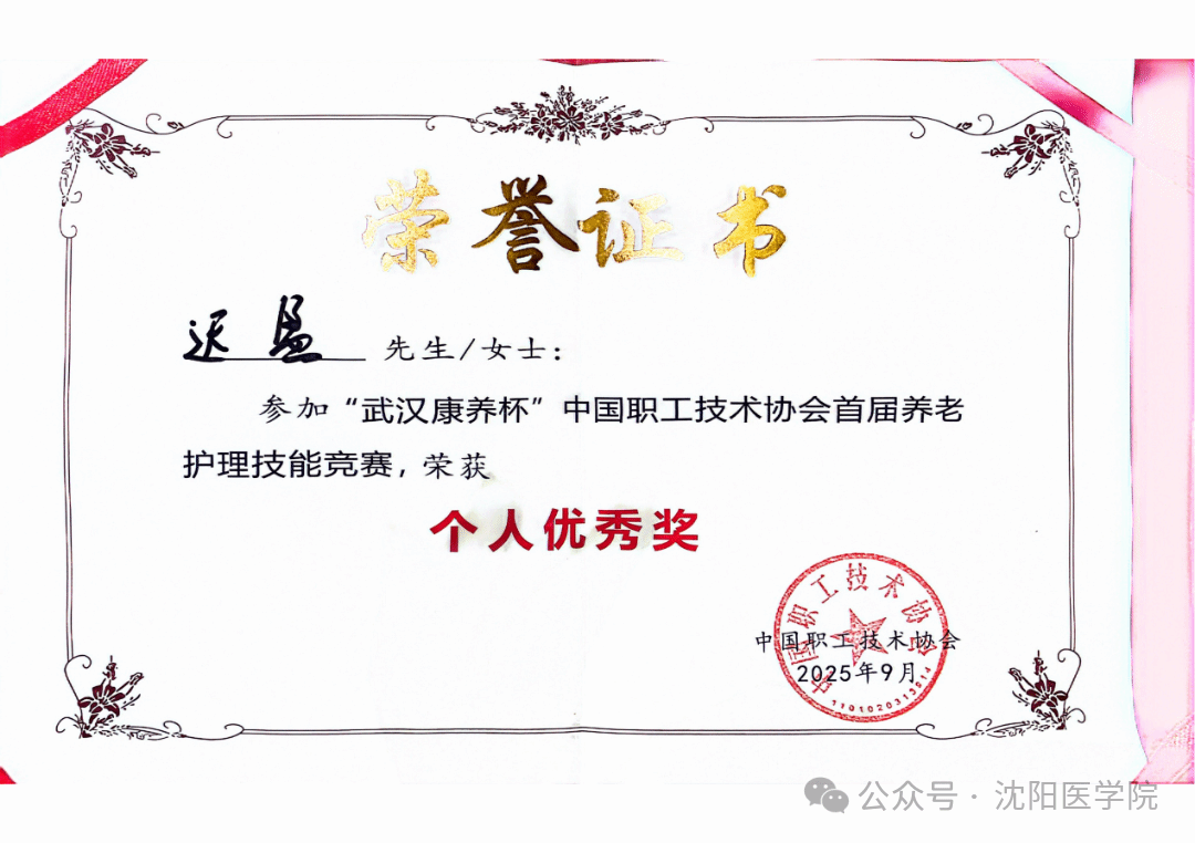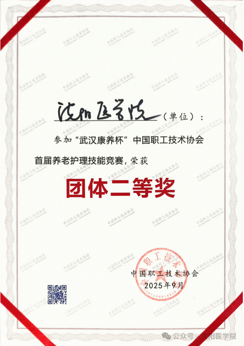 近日,“武汉康养杯”中国职工技术协会首届养老护理技能竞赛在湖北武汉圆满落幕。我校由医养健康产业学院学生组成的代表队斩获学生组团体二等奖。付芸嘉、杨怡婷两名同学荣获个人铜牌,迟盈、张智文两名同学荣获个人优秀奖。