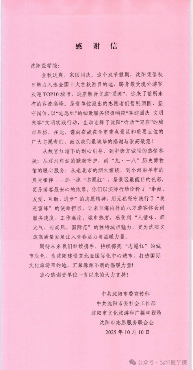 在今年的国庆和清明节假期,沈阳跻身文旅“顶流”。在这张骄人的成绩单上,沈阳医学院“沈小青”们的志愿精神,留下了浓墨重彩的一笔。他们的付出,获得了官方的高度认可!近日,中共沈阳市委宣传部等多部门联合发来感谢信,专门为“沈小青”在假期的细致服务和无私奉献点赞。