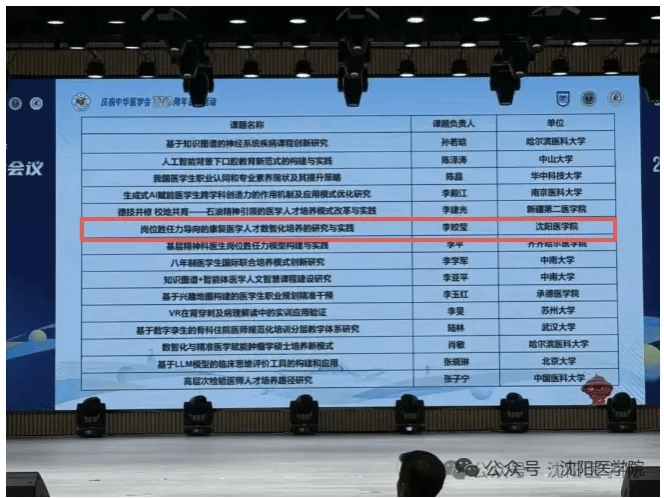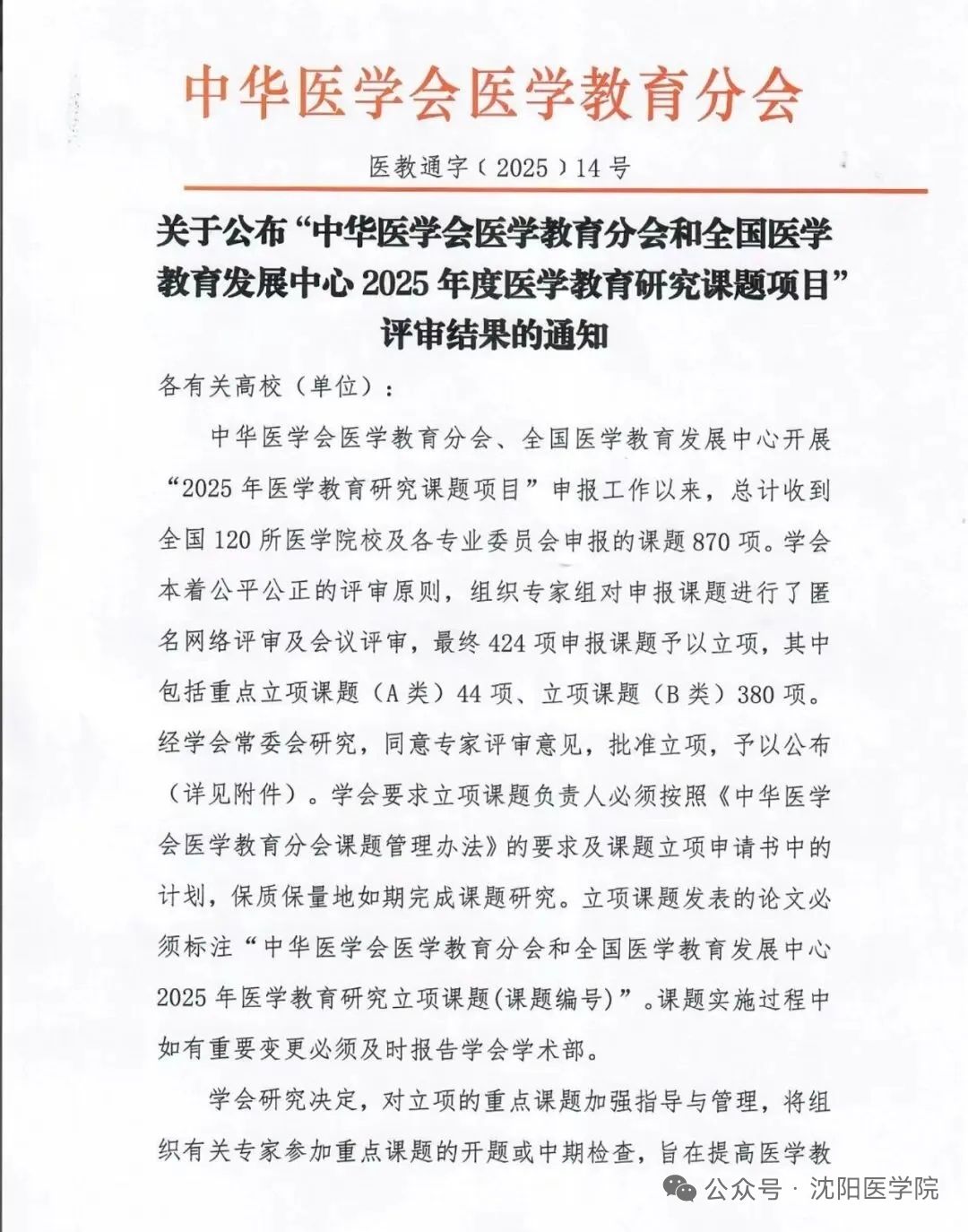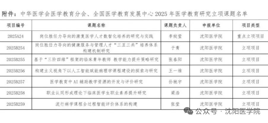 近日,中华医学会医学教育分会和全国医学教育发展中心公布了2025年度医学教育研究课题立项名单。沈阳医学院共获批7项课题,其中康复学院李姣莹副教授的《岗位胜任力导向的康复医学人才数智化培养的研究与实践》项目获批重点课题立项,这也是学校在医康养领域人才培养连续获批重点课题立项,彰显了该方向的研究积累与影响力。