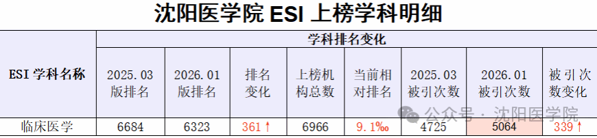 2025年3月,我校临床医学学科首次进入ESI全球前1%,实现了学校学科建设的历史性突破,也是沈阳市属高校首个进入ESI全球前1%的学科。此次临床医学学科在全球进入前1%的6966个研究机构中排名第6323位,当前被引次数达5064次,位次排名较首次进入提高近10%,标志着我校临床医学学科的国际学术竞争力跃上了一个新高度,充分彰显了学校“十四五”期间以学科建设为引领、特色发展的成效,为建设应用型医科大学注入强劲动能。