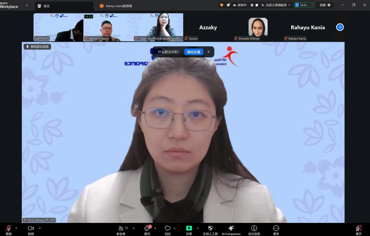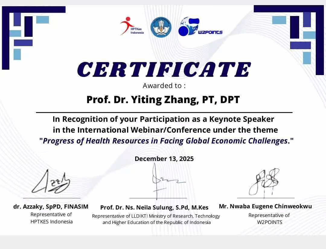 近日,由印度尼西亚卫生健康高等院校协会(HPTKes)主办,印度尼西亚研究、技术与高等教育部联合 W2POINTS 及 ESER BLOCKCHAIN TECHNOLOGY 协办的“应对全球经济挑战中健康资源进展”国际研讨会在线上成功举办。我校康复学院教师张一婷受邀参会,并以主旨演讲形式分享学术见解。